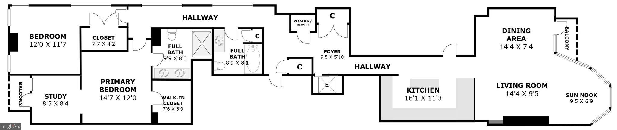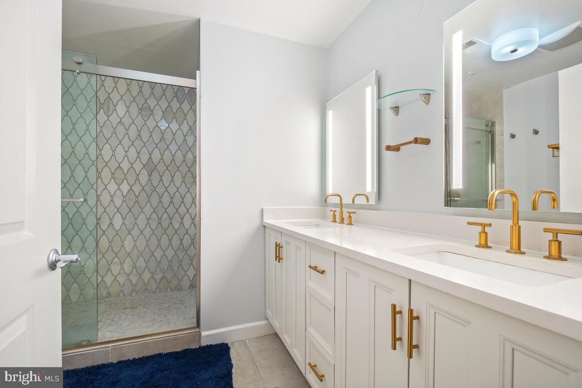 The home offers two spacious bedrooms and two full bathrooms, and a separate study/home office. The primary suite features excellent closet space, a cozy sitting or office area, and access to a private balcony. The spa-like en-suite bath includes dual quartz vanities, oversized mirrors, and a luxurious glass-enclosed marble shower. The second bedroom is equally inviting, with its own beautiful finishes and access to the second full bath.