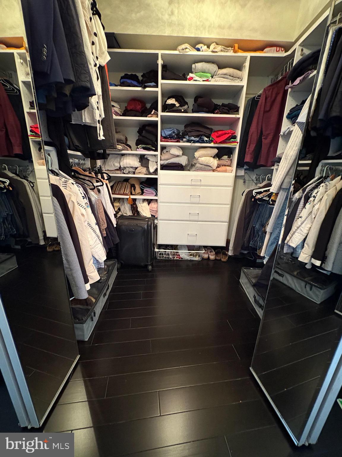 The spacious primary suite offers a walk-in closet and a beautifully designed en-suite bathroom with soaking tub, mini French doors, and bidet. The second bedroom, perfect as a guest room or home office, features floor-to-ceiling sliding doors and access to a second full bath with marble finishes and bidet.