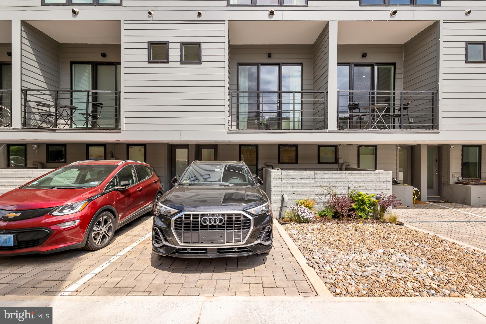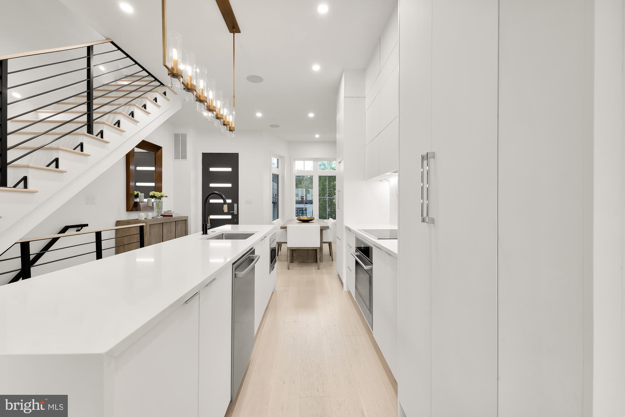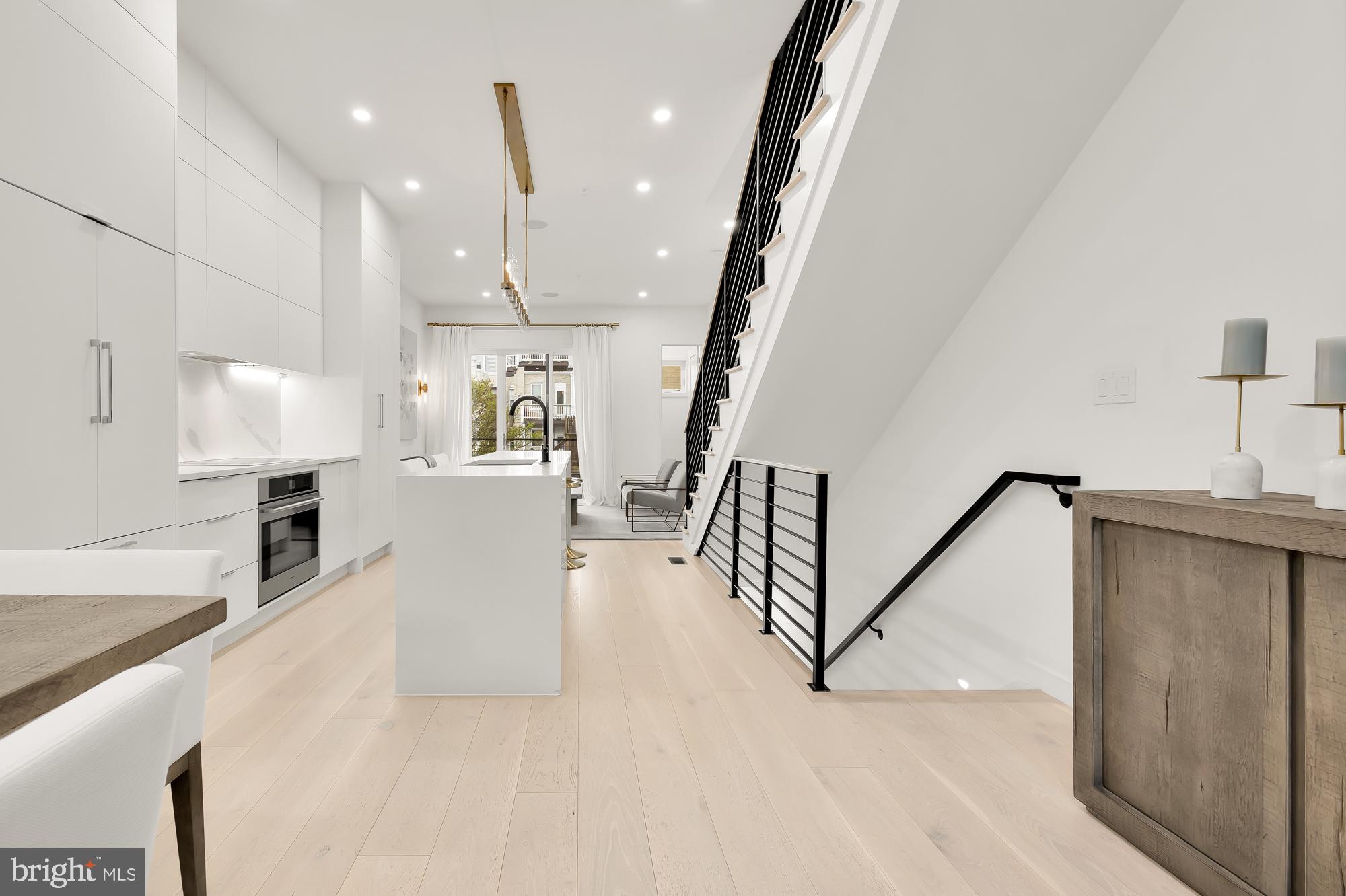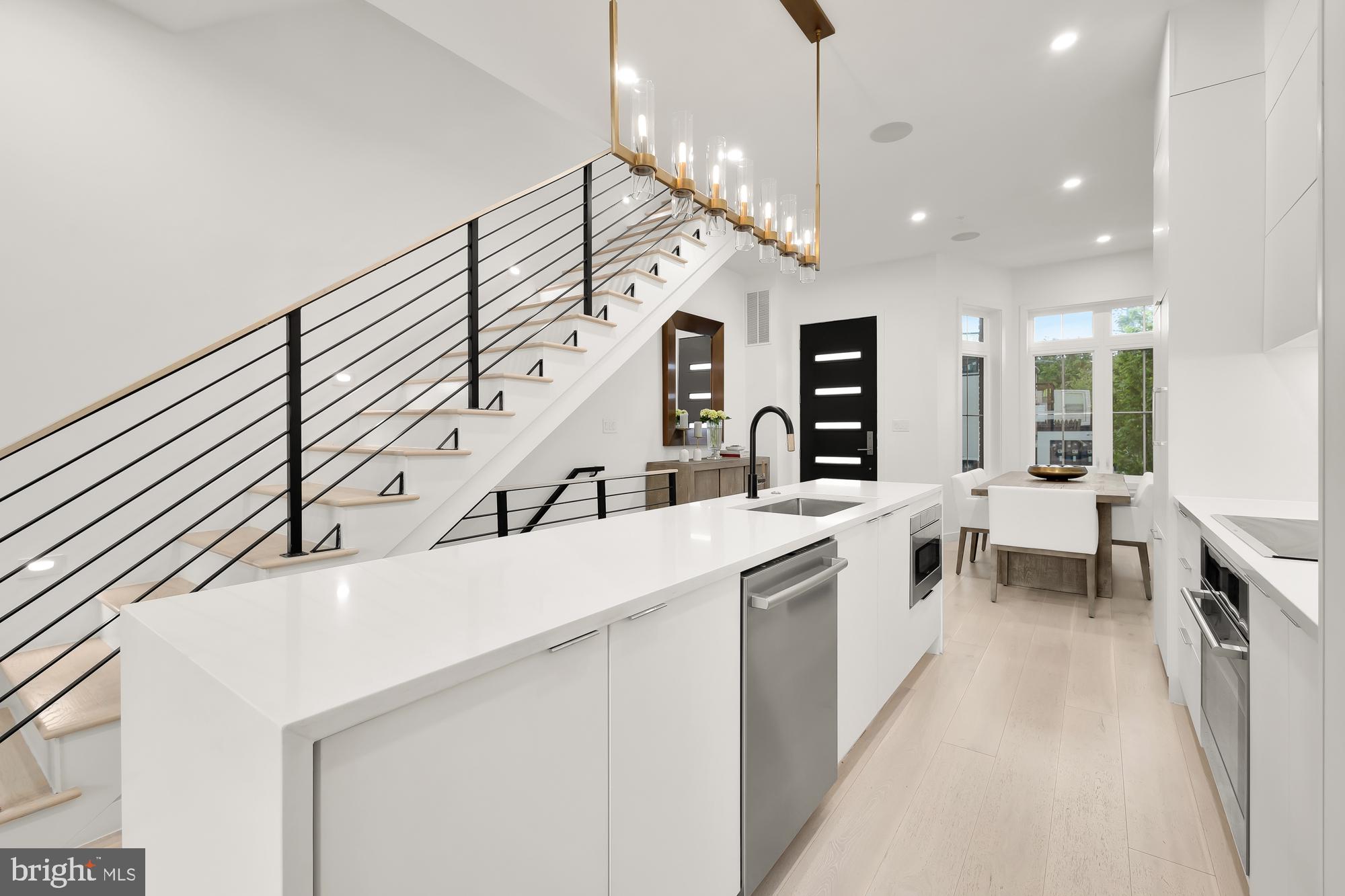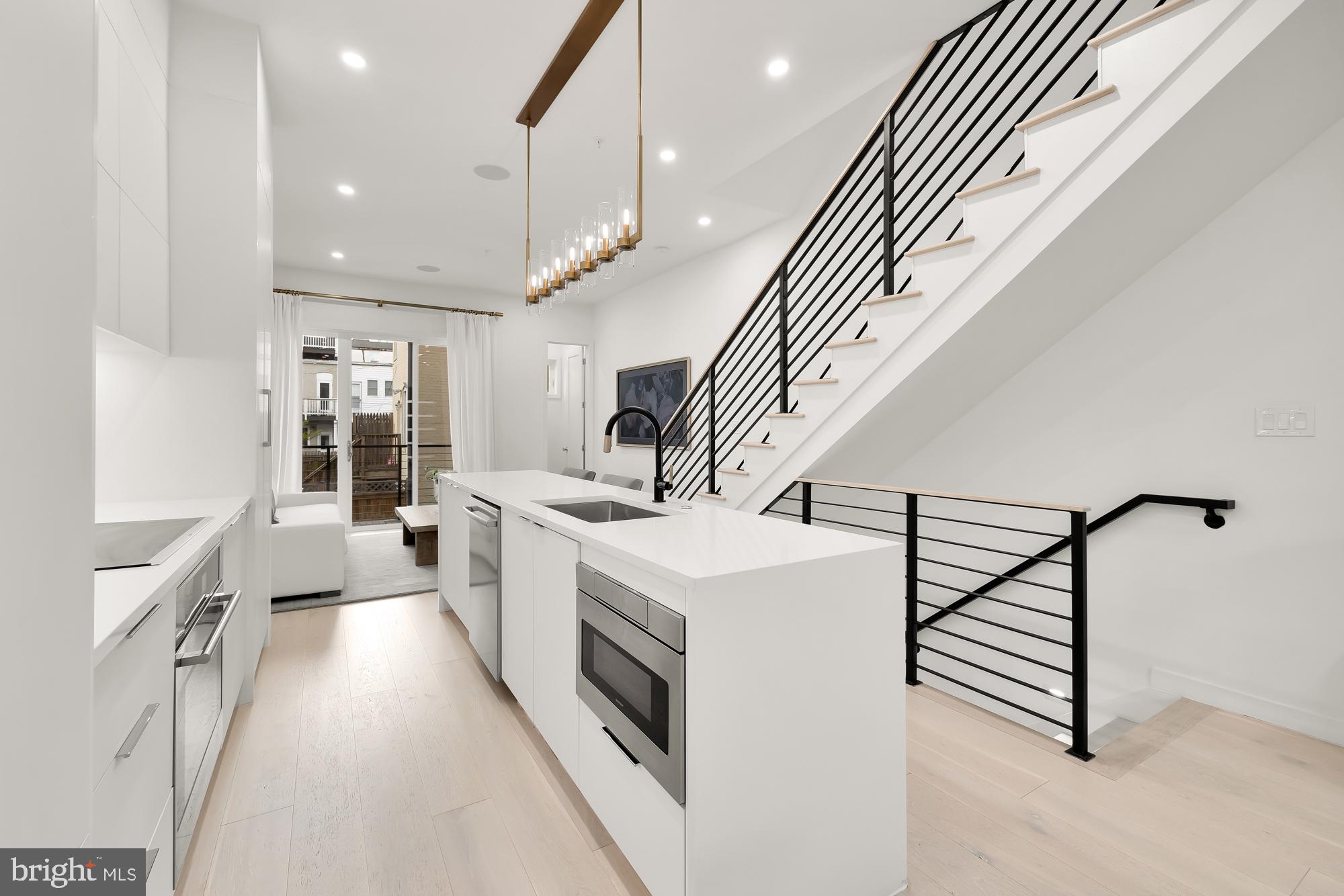 Upon entry, prepare to be captivated by the soaring 10-foot ceilings, abundant natural light, stunning contemporary finishes throughout, and newly added Restoration Hardware light fixtures. The main level revolves around the gourmet kitchen, featuring high-end appliances, pristine white shaker cabinets, and elegant quartz countertops. This level also encompasses a spacious dining and living area that seamlessly extends to a private balcony, providing an ideal space for morning relaxation or evening gatherings. A half bathroom adds further convenience for guests, complemented by a two-level Sonos sound system that enhances the ambiance throughout the home.