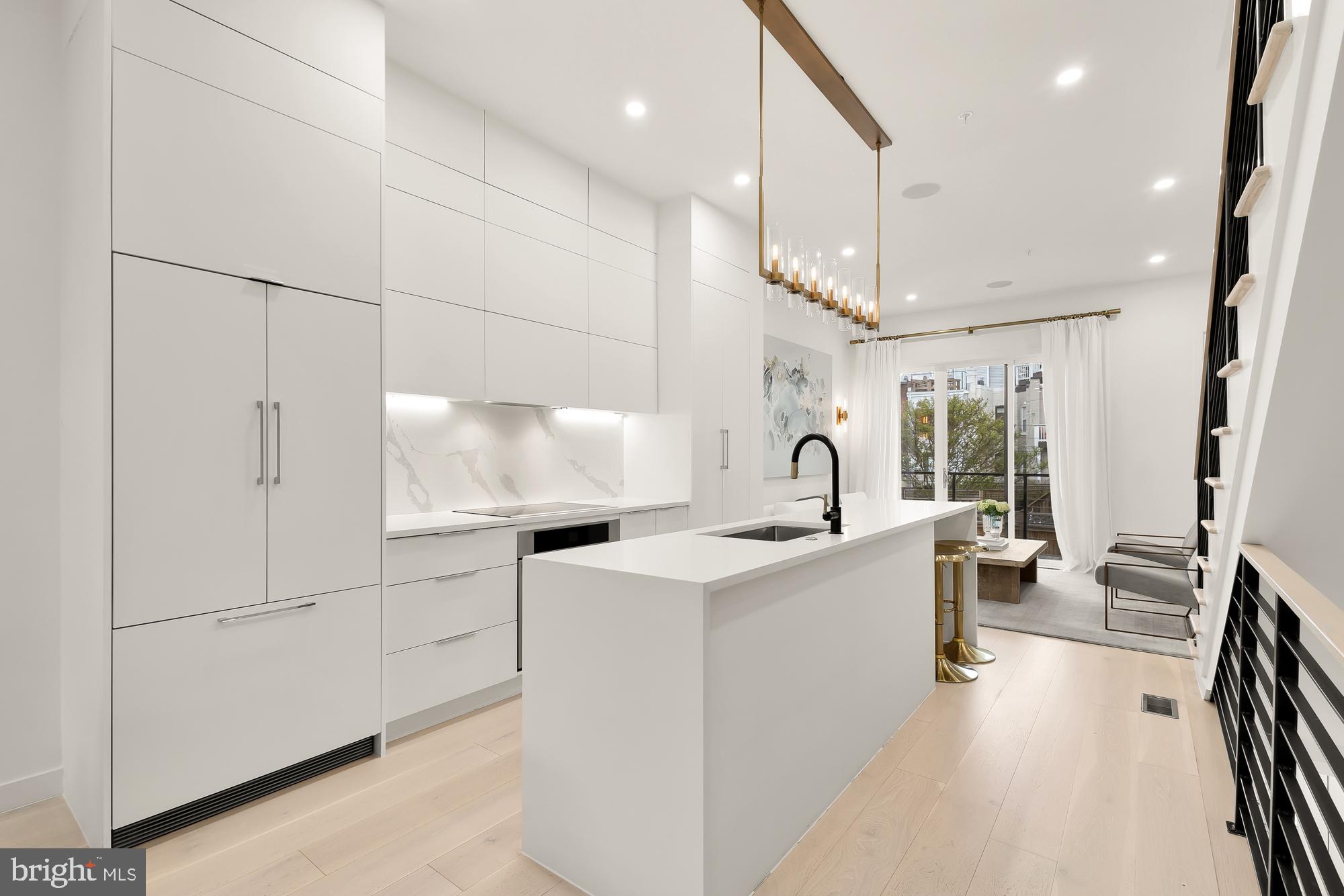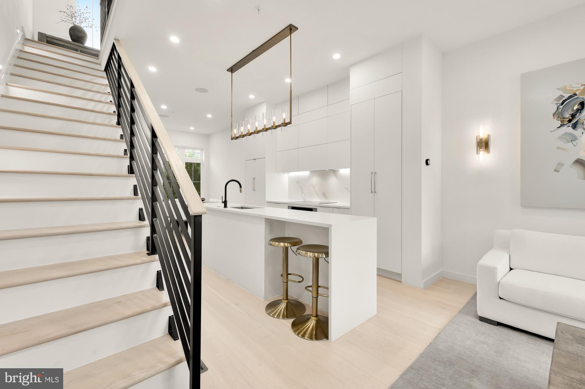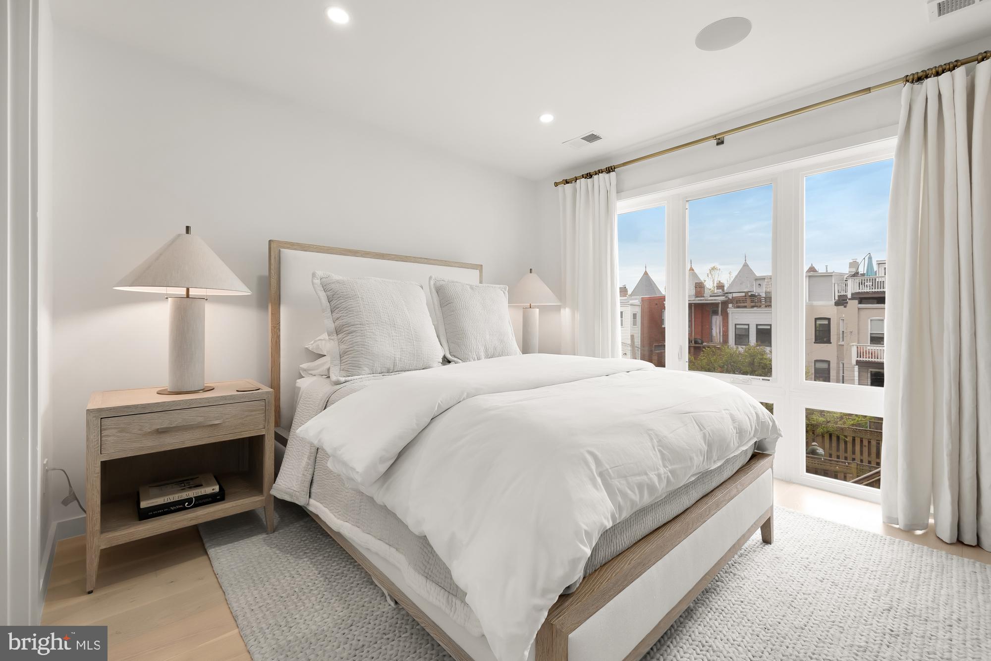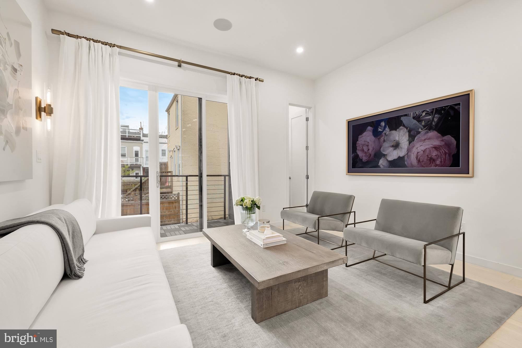 The top level hosts a guest bedroom, a full bathroom, and a den (or bedroom) with a sophisticated integrated wet bar and wine fridge, perfect for hosting and entertaining. Step out from the den onto the private roof deck to indulge in breathtaking panoramic city views and a sweeping vista of the monument.