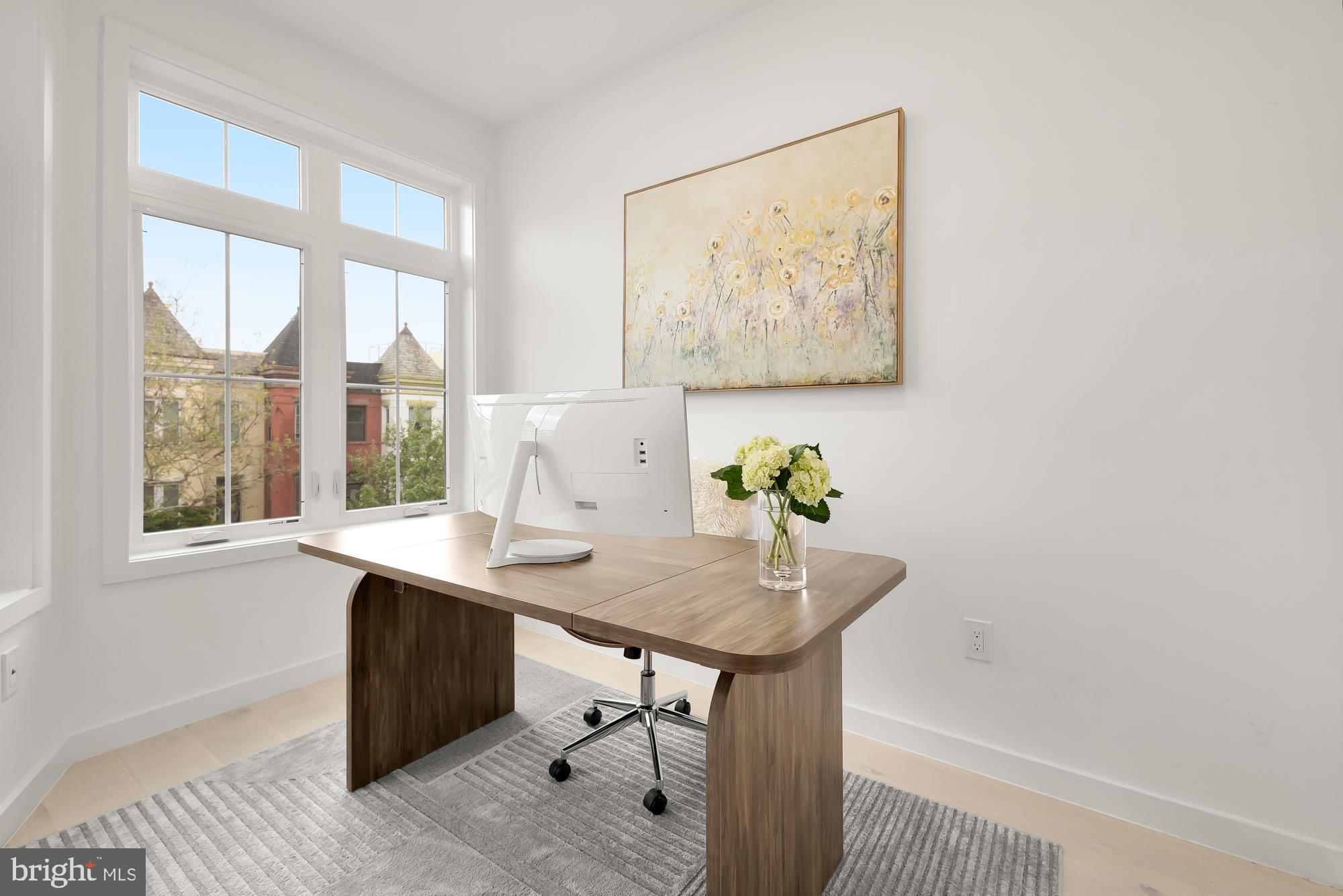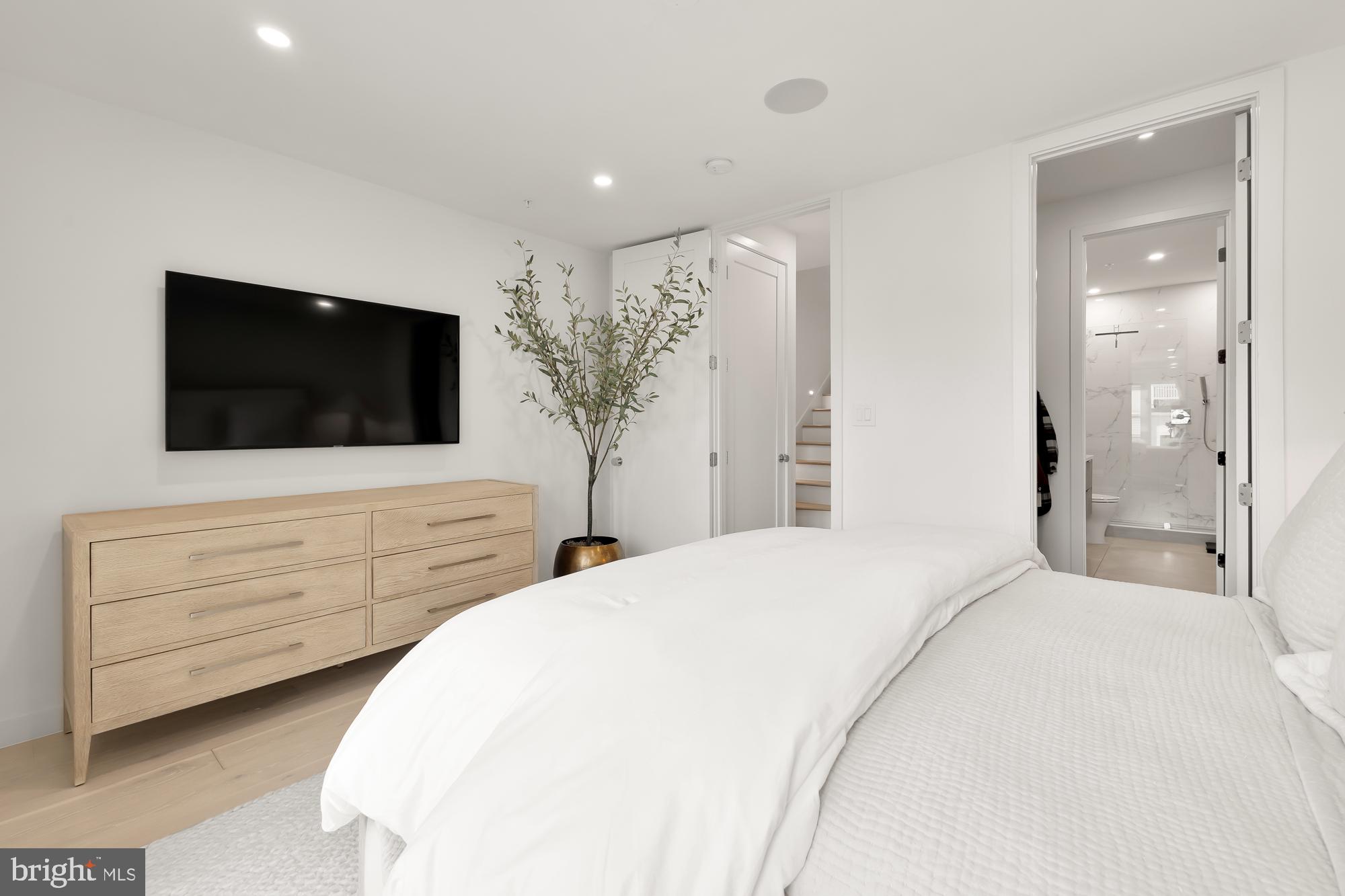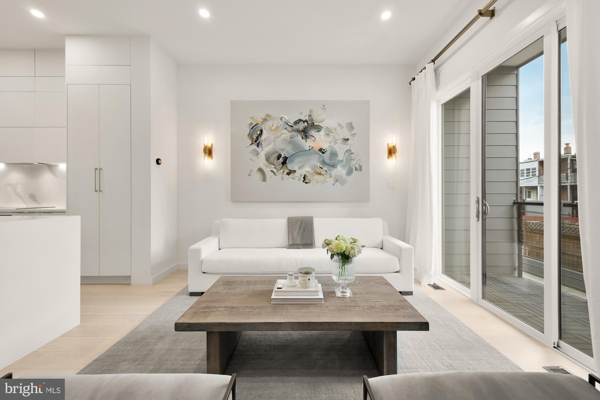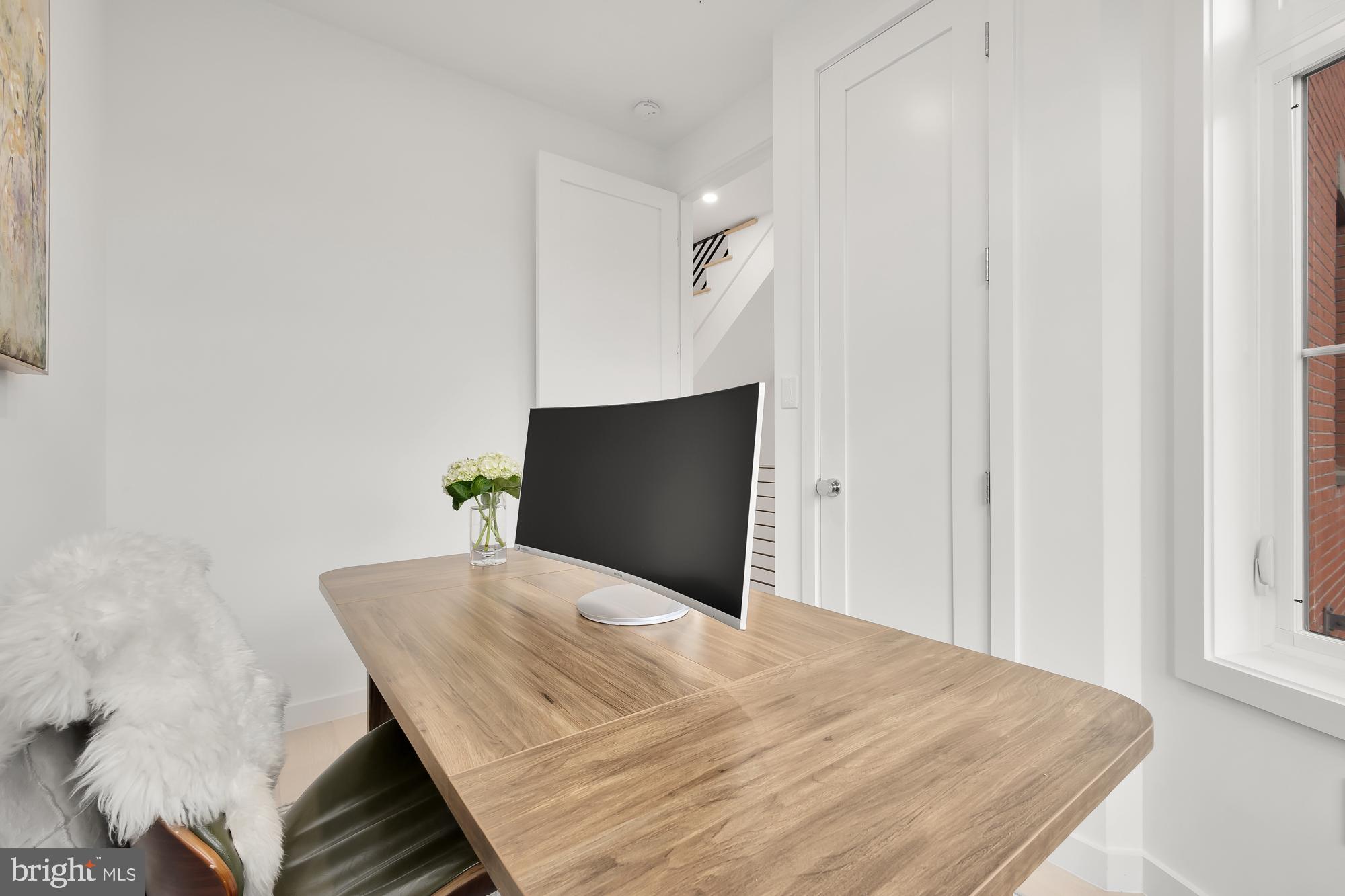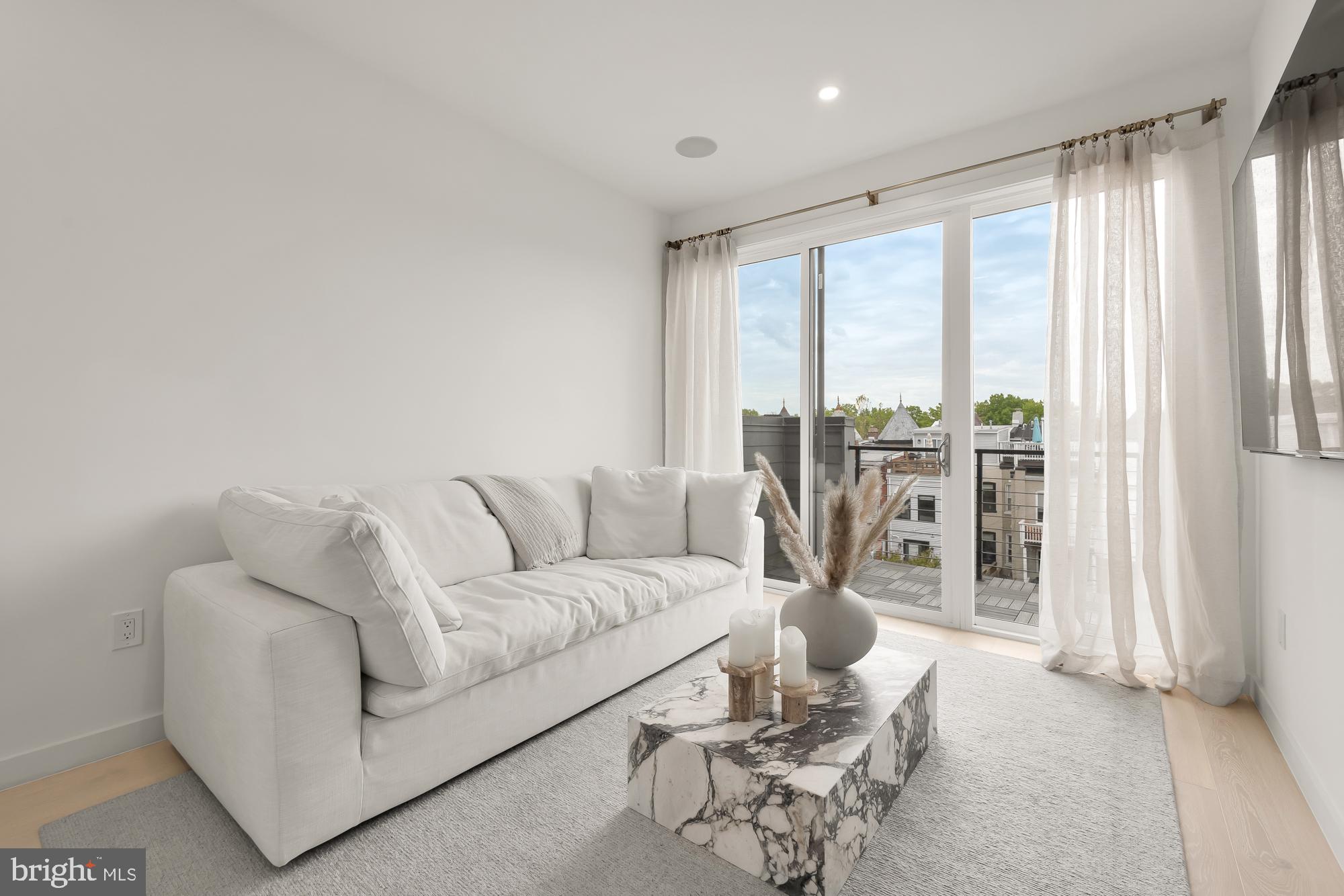 The top level hosts a guest bedroom, a full bathroom, and a den (or bedroom) with a sophisticated integrated wet bar and wine fridge, perfect for hosting and entertaining. Step out from the den onto the private roof deck to indulge in breathtaking panoramic city views and a sweeping vista of the monument.