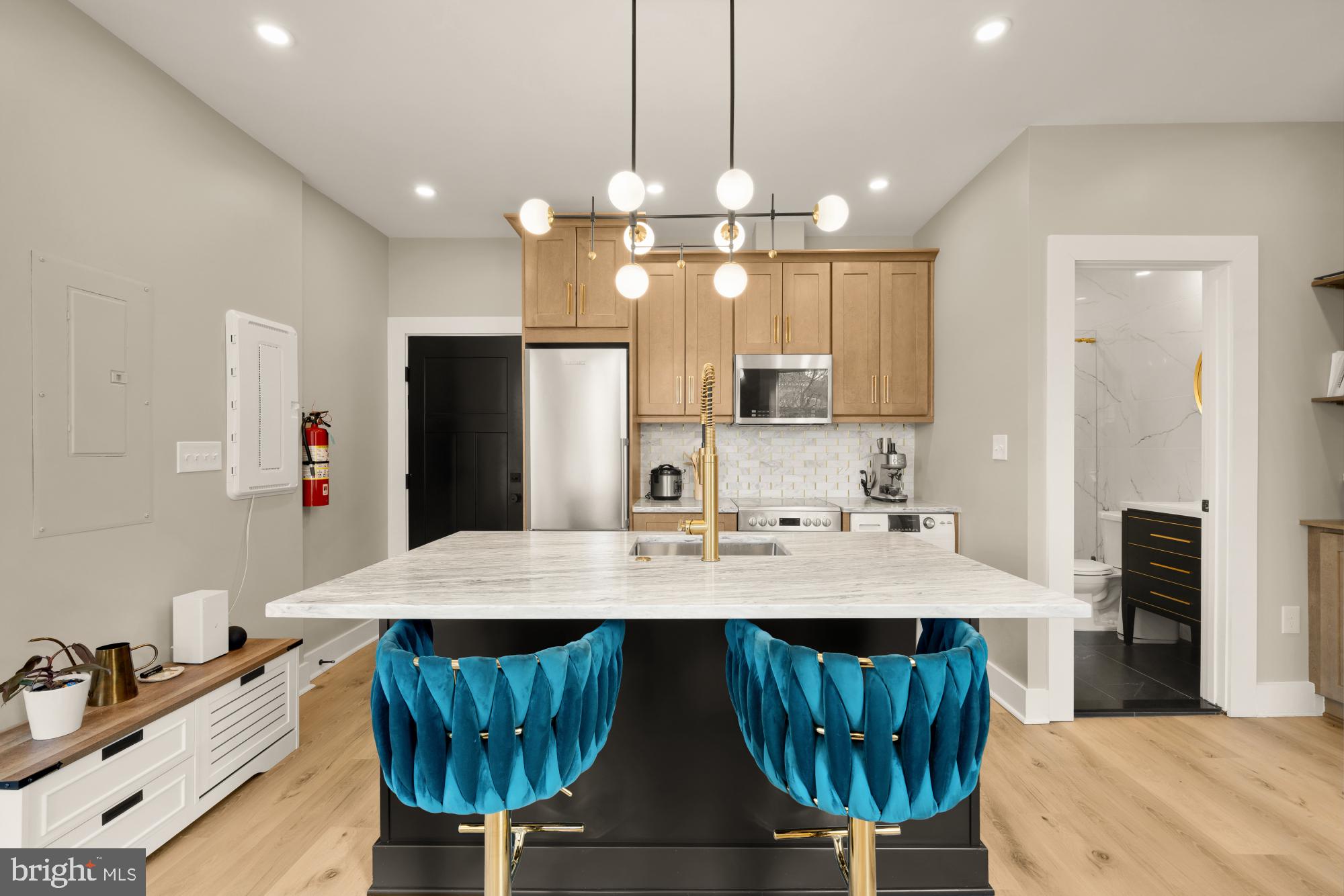 Soaring ceilings, oversized windows, and a lovely bay window flood the home with natural light, creating a bright and inviting atmosphere. The efficient gourmet kitchen showcases luxury appliances, a dishwasher, and elevated finishes that must be seen to be appreciated. A custom built-in Murphy bed with additional storage adds smart functionality, while the highly styled bath and in-unit washer and dryer provide everyday comfort and convenience.