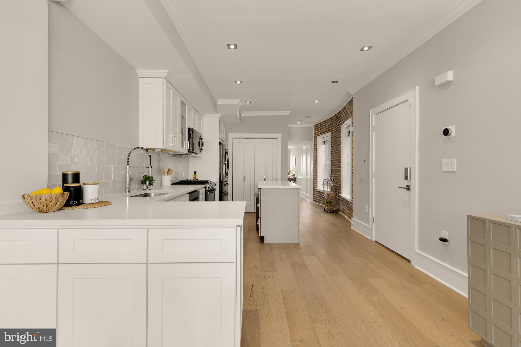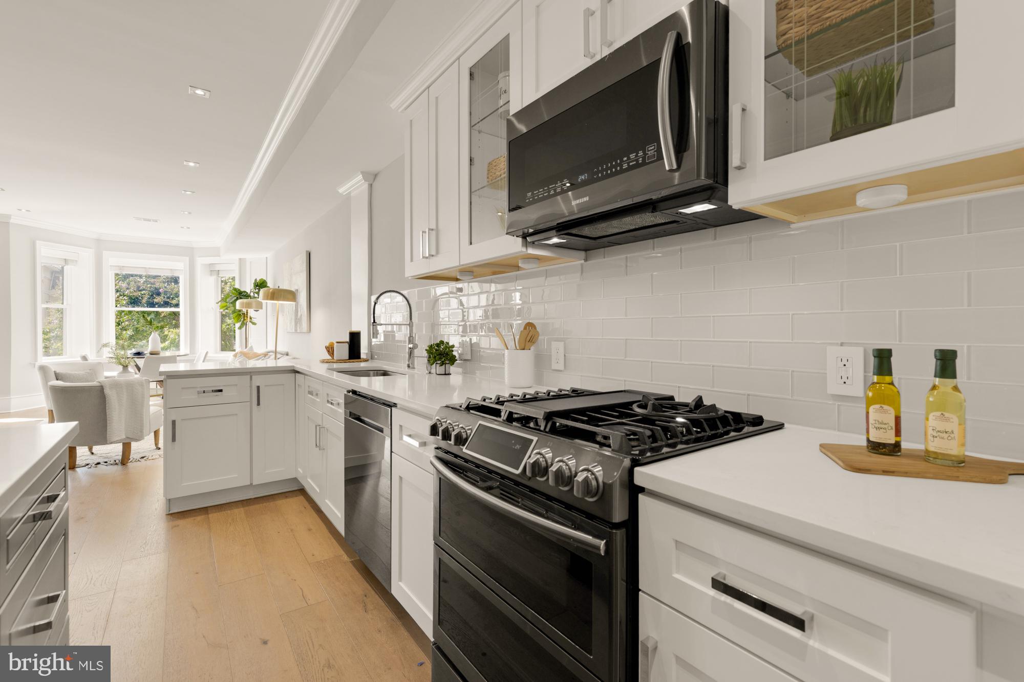 Step inside to find a beautifully renovated interior featuring wide-plank hardwood floors, exquisite millwork, and abundant natural light. The spacious living room, anchored by a charming bay window, flows seamlessly into the gourmet kitchen, complete with quartz countertops, white shaker cabinetry, and premium stainless steel appliances.