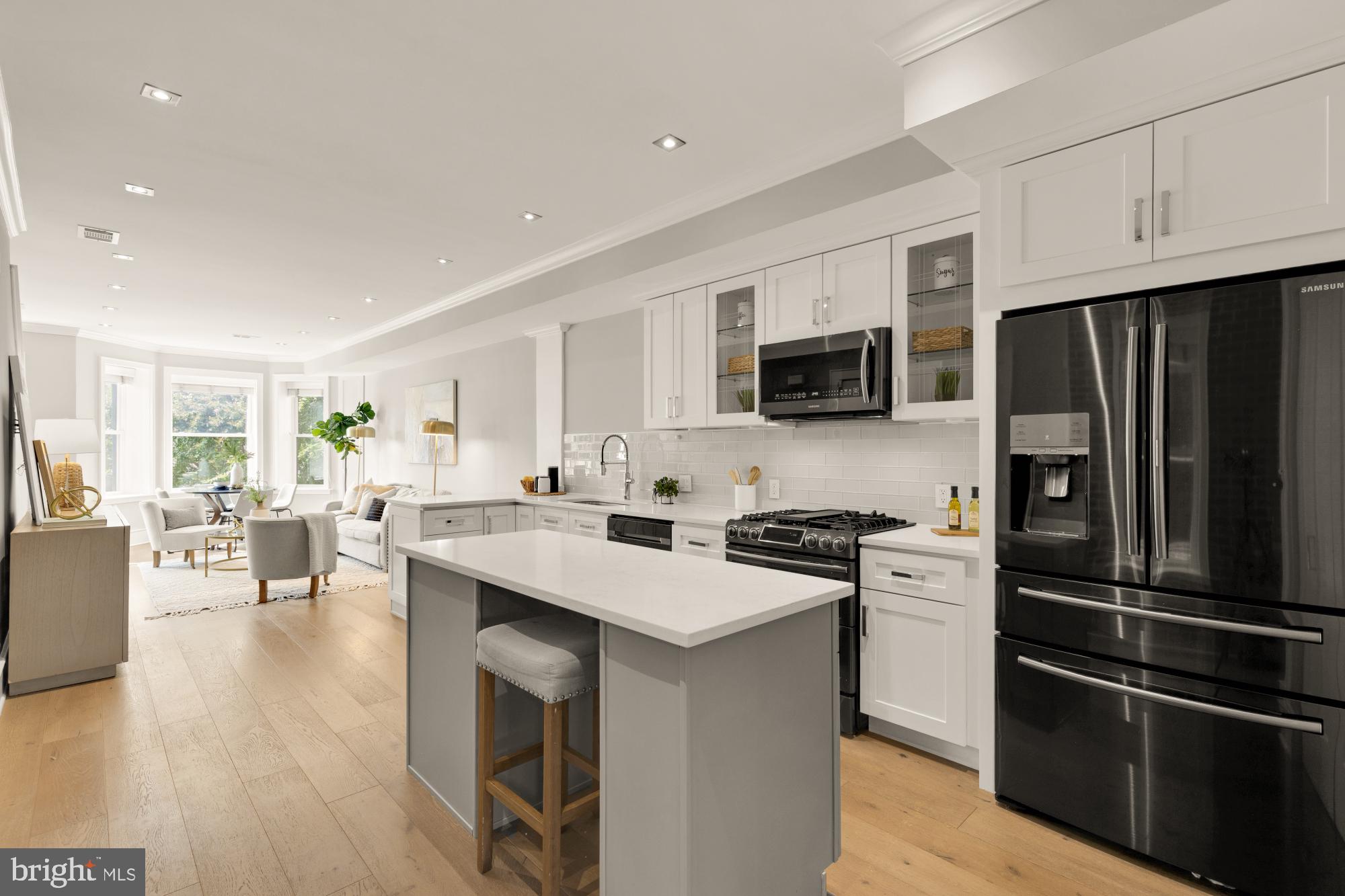Welcome to this upper-level townhouse-style condo that perfectly marries historic charm with modern sophistication. Step inside to find a beautifully renovated interior featuring wide-plank hardwood floors, exquisite millwork, and abundant natural light. The spacious living room, anchored by a charming bay window, flows seamlessly into the gourmet kitchen, complete with quartz countertops, white shaker cabinetry, and premium stainless steel appliances.