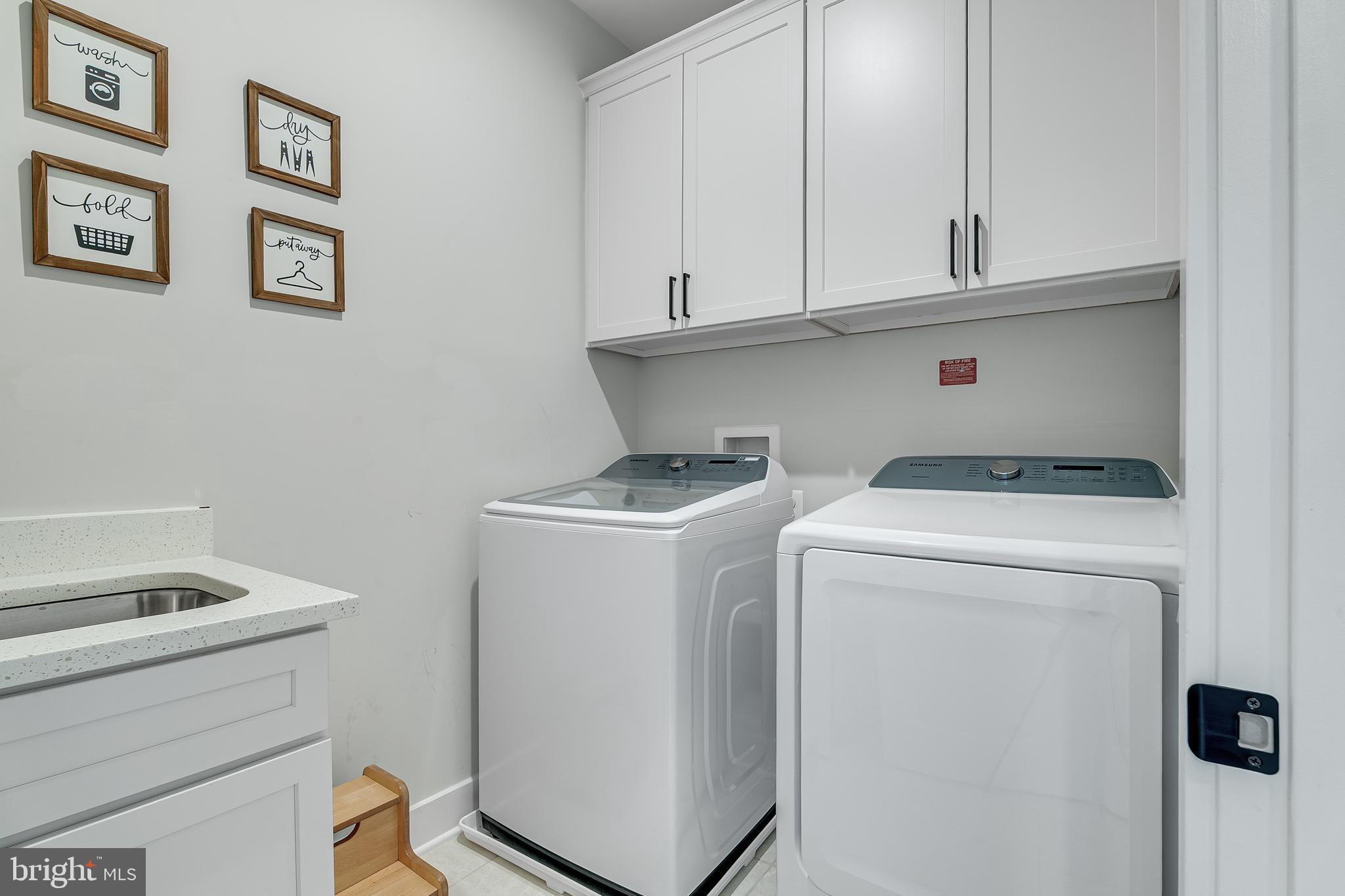 On the third level, you'll find two generously sized bedrooms. The primary bedroom has a huge walk in closet and an en suite bath room with double sinks and a double walk in shower. The second bed room has an en suite bathroom as well, ensuring privacy and comfort for family or guests. The walk-in laundry room, complete with a sink and cabinetry, makes tackling chores a breeze.