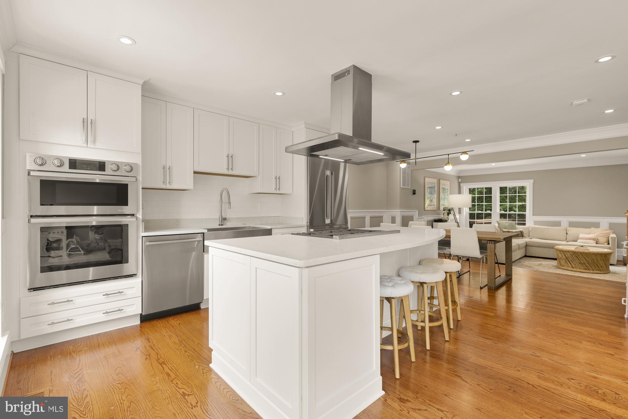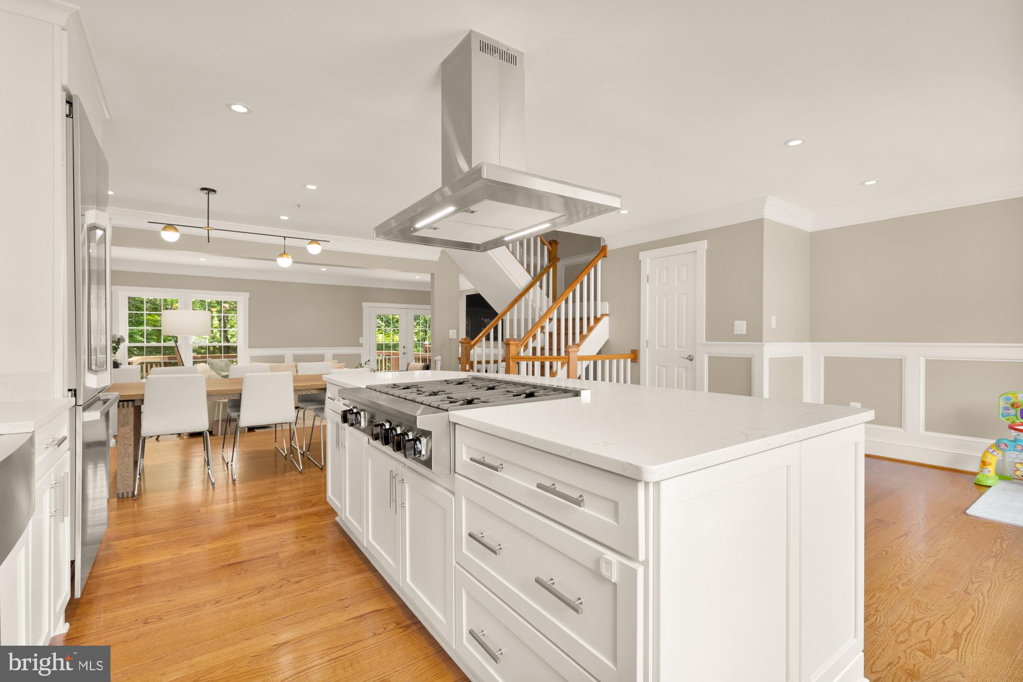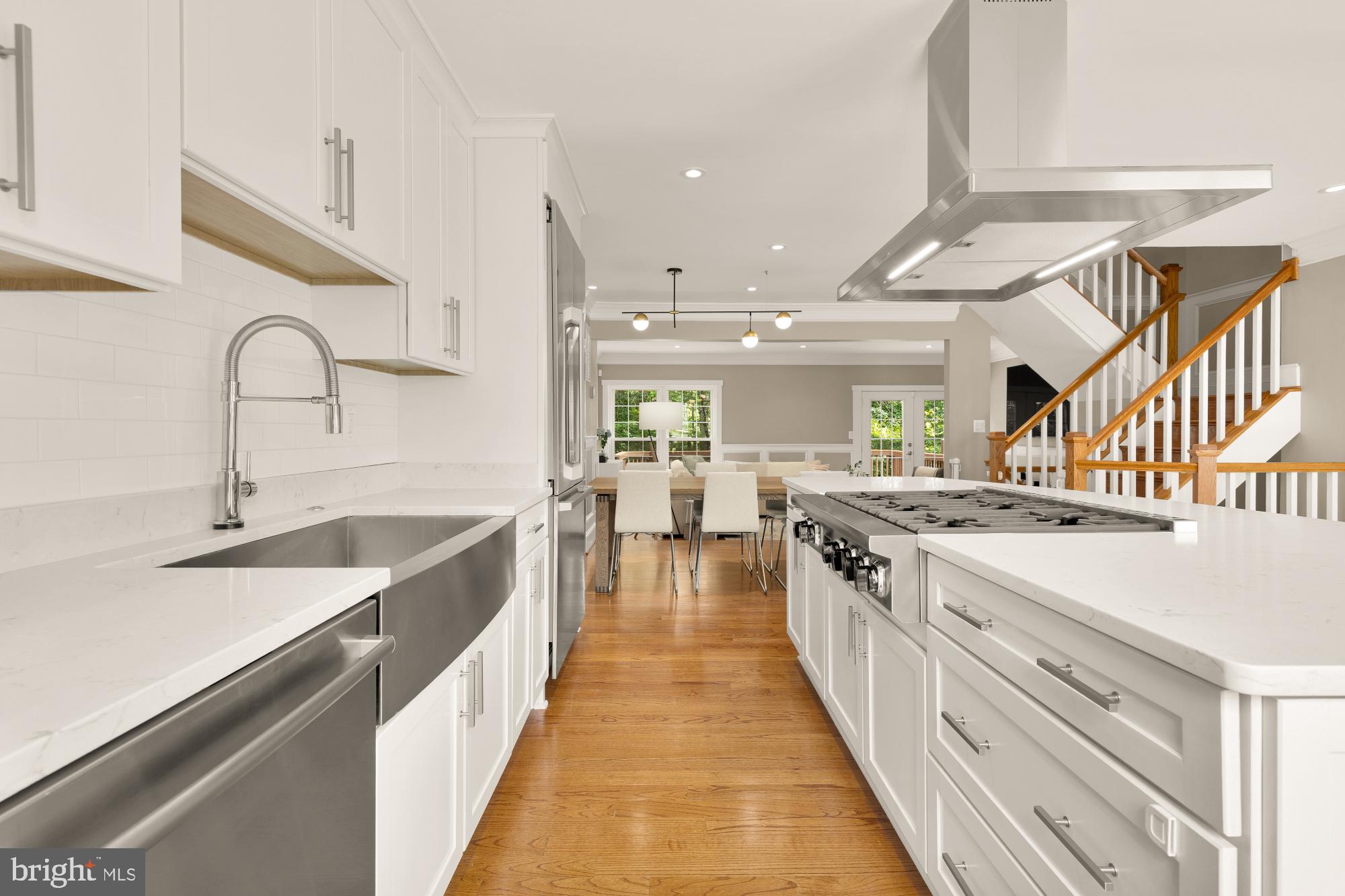 The gourmet kitchen is a chef's dream, featuring premium stainless steel appliances including a professional-grade six-burner stove, a spacious center island, and ample custom cabinetry. The kitchen flows seamlessly into the dining and living areas, creating an ideal space for gatherings.