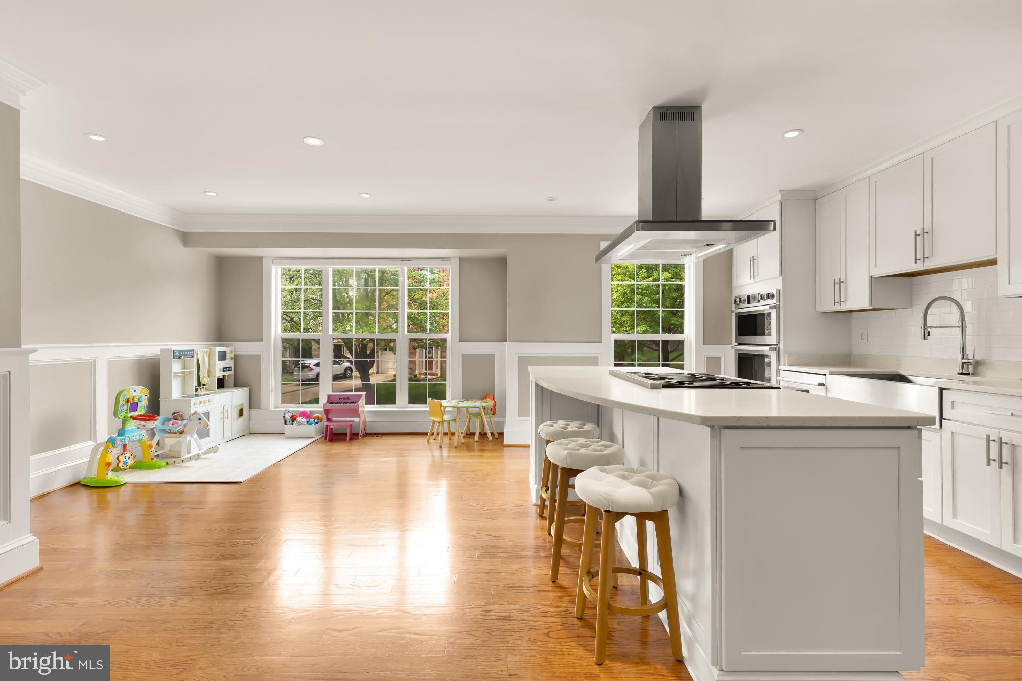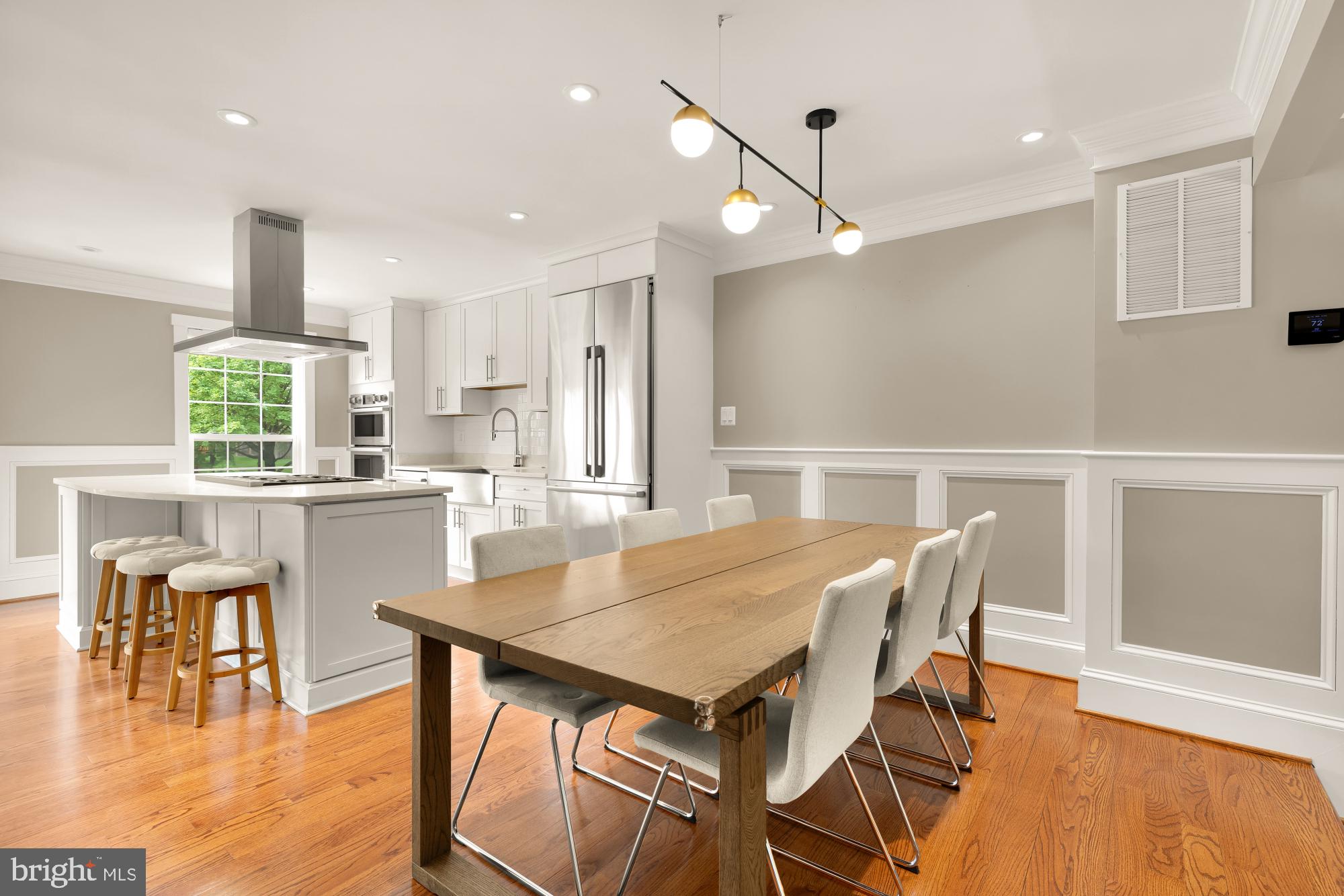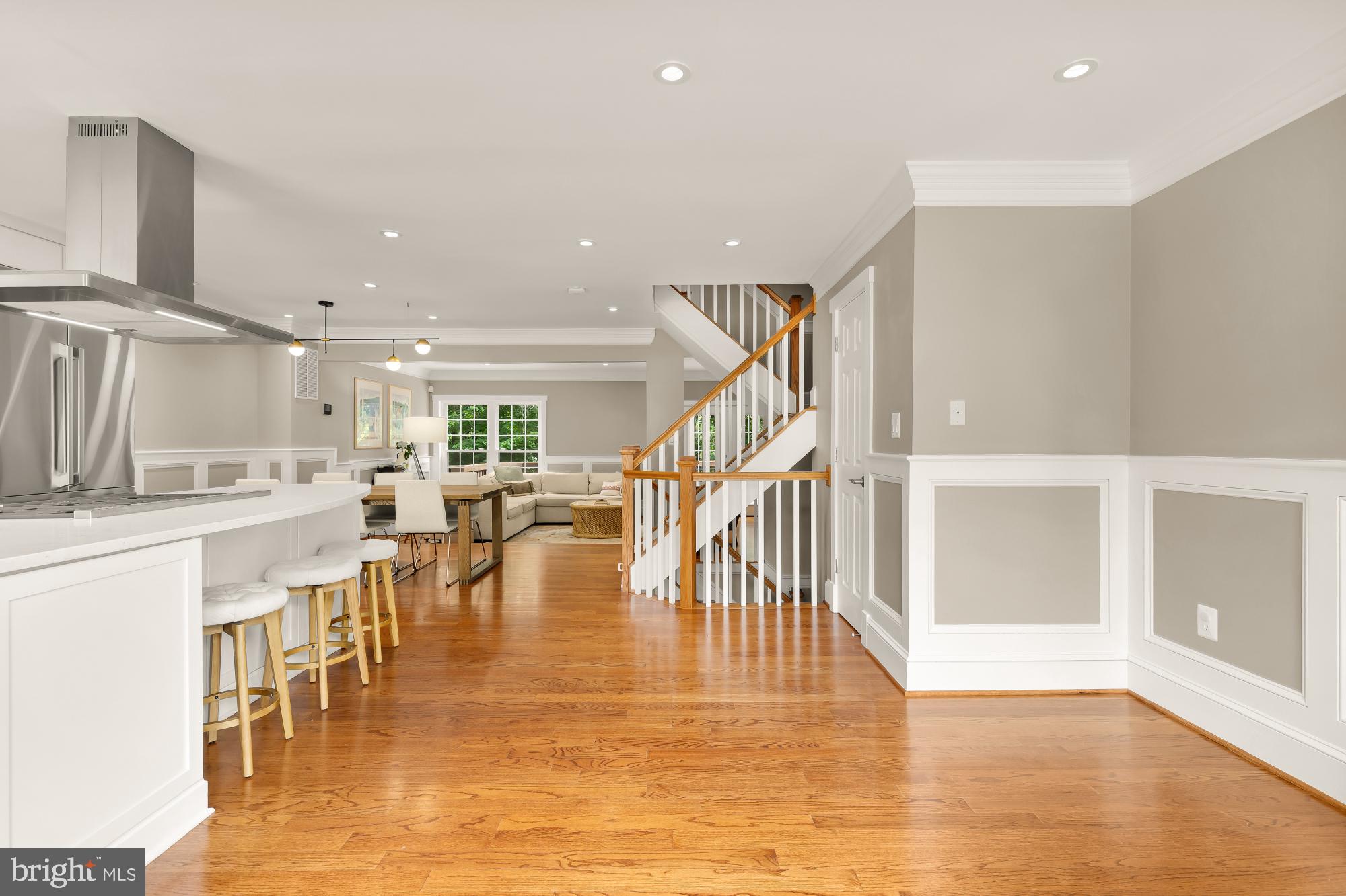 The gourmet kitchen is a chef's dream, featuring premium stainless steel appliances including a professional-grade six-burner stove, a spacious center island, and ample custom cabinetry. The kitchen flows seamlessly into the dining and living areas, creating an ideal space for gatherings.